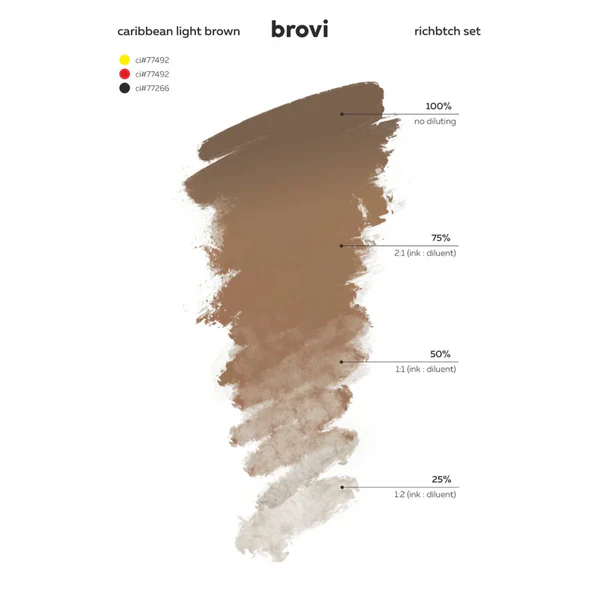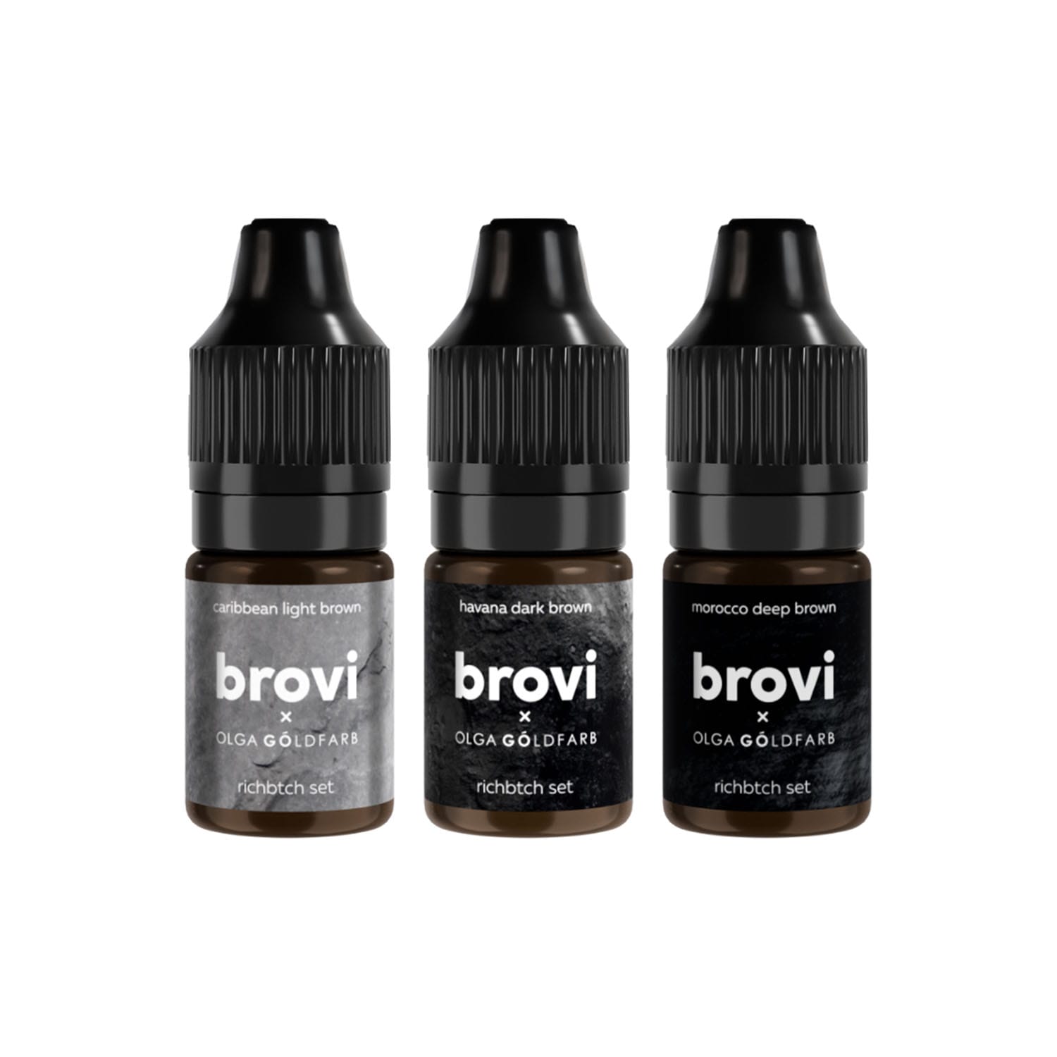 The Richbtch pigment set from the BROVI brand is a collection of 3x5ml brown pigments recommended for eyebrow treatments (Caribbean Light Brown, Havana Dark Brown, Morocco Deep Brown).