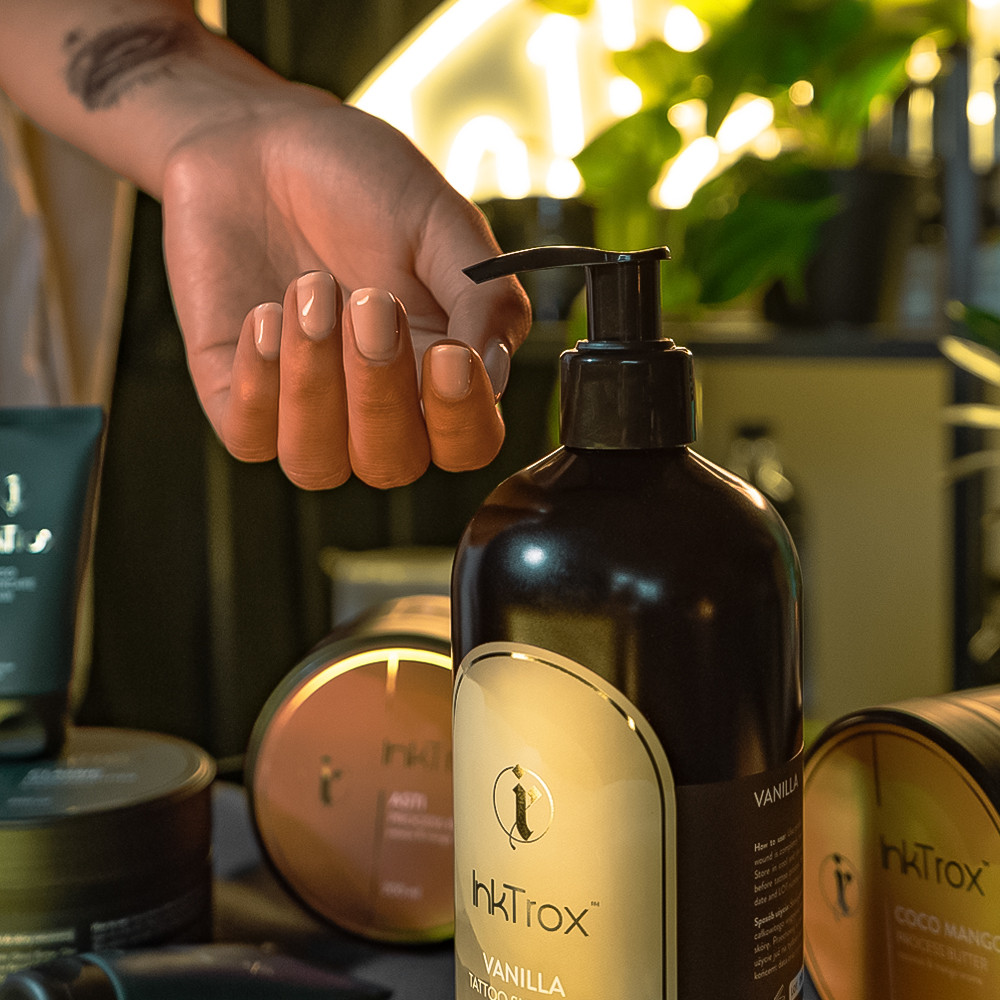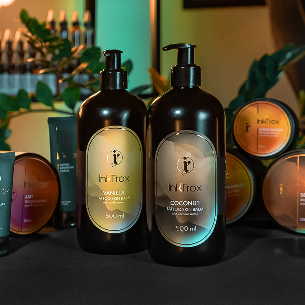 Use InkTrox Vanilla at least a week before your tattoo session to properly prepare your skin. Once healed, apply the balm daily to maintain vibrant colors and healthy-looking skin. Because tattoo care isn’t a one-time act – it’s a daily commitment to quality. The bottle with a convenient pump offers not only ease of use but also a great price-to-volume ratio. It’s the perfect choice for anyone looking for effective, long-lasting, and enjoyable skincare – whether your skin is tattooed or not.