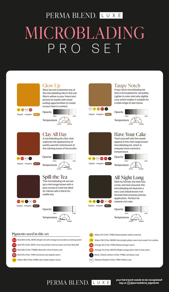 This premium Microblading Ink from the PMU experts at Perma Blend Luxe comes in an easy-to-use pump bottle and a variety of shades to suit all clients.