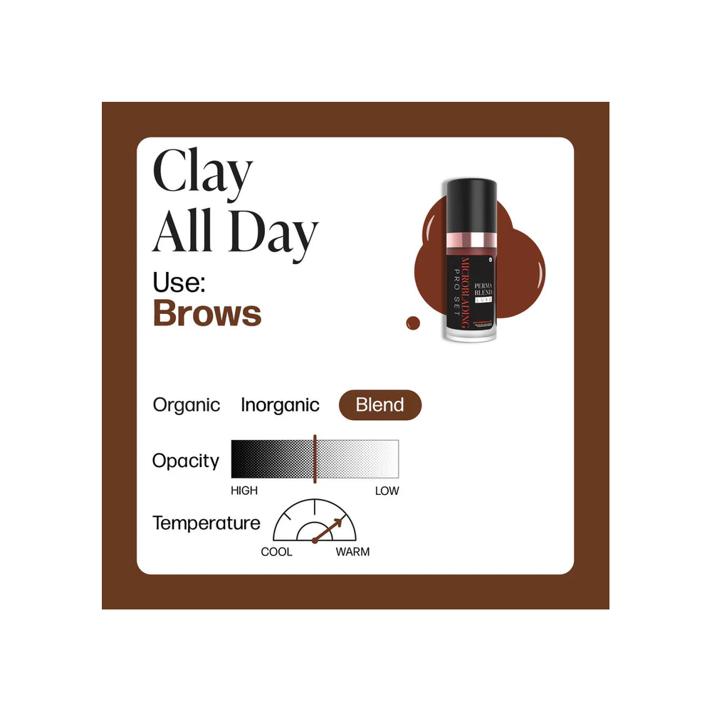 Clay All Day from The Perma Blend Luxe Microblading Pro Set is a warm, earthy brown Microblading Ink with medium opacity and terracotta tones, made with a blend of organic and inorganic ingredients.